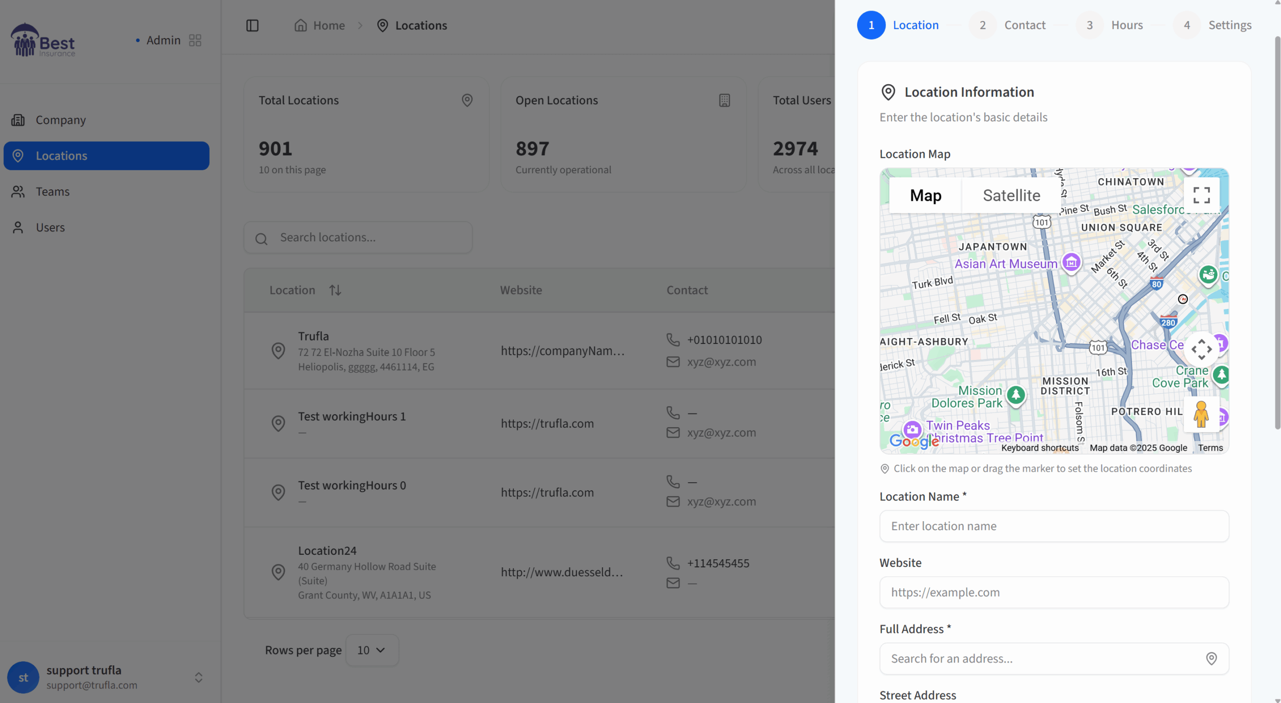 Create and manage physical locations with real-time maps, business hours, contact info, and user assignments.